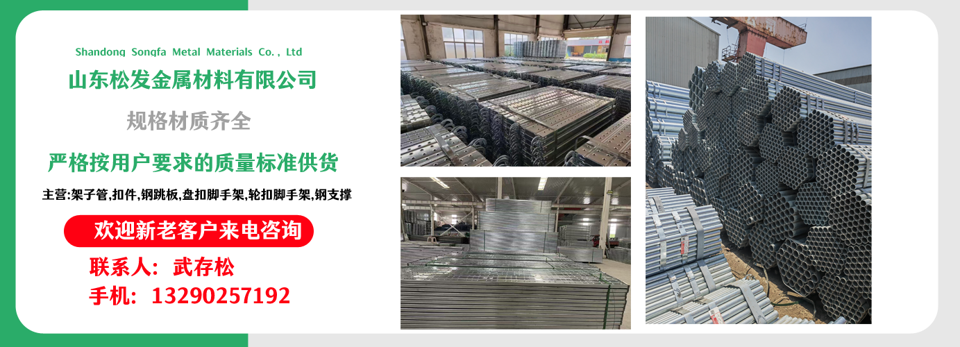 山東松發金屬材料有限公司主營架子管,扣件,鋼跳板,盤扣腳手架,輪扣腳手架,鋼支撐生產廠家。本廠專業生產銷售?! 〗ㄖ眉茏庸堋?主要用于房建,橋梁,鐵路,公路,地鐵,水庫,隧道,支撐?! 〖茏庸?扣件,鋼跳板,盤扣腳手架,輪扣腳手架,鋼支撐的優越性及應用“ ”產品因具有結構簡單合理、設計巧妙、使用方便、安全、快捷、易于運輸、儲存、維護簡單等特點?! 」疽回瀳猿帧百|量,用戶至上,優質服務,信守合同”的宗旨,憑借著高質量的產品,良好的信譽,優質的服務,產品暢銷全球。歡迎廣大客戶來電洽談,共同發展,共創輝煌! 山東松發金屬材料有限公司秉承誠信服務、恪守信譽的宗旨,在同等的質量下,保證以最低的價格,最完善的服務,最高的信譽來答謝各界朋友的支持和厚愛,歡迎您的來電、咨詢,我們將竭誠為您服務!...